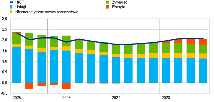 Inflacja według projekcji spadnie z 2,1% w 2025 do 1,9% w 2026, a następnie do 1,8% w 2027, po czym w 2028 wzrośnie do poziomu średniookresowego celu EBC wynoszącego 2%. Oczekiwany spadek inflacji ogółem (mierzonej zharmonizowanym wskaźnikiem cen konsumpcyjnych – HICP) na początku 2026 jest odzwierciedleniem ujemnego efektu bazy wynikającego z cen energii, podczas gdy inflacja składowych nieenergetycznych powinna dalej słabnąć przez cały 2026. Według przewidywań kontrybucja inflacji cen energii do inflacji ogółem pozostanie niewielka aż do ostatnich miesięcy 2027, po czym wyraźnie zwiększy się w 2028 w związku z oczekiwanym wdrożeniem unijnego systemu handlu uprawnieniami do emisji 2 (ETS2), którego wzrostowe oddziaływanie na inflację ogółem wyniesie 0,2 pkt proc. Oczekuje się, że inflacja HICP z wyłączeniem cen energii spadnie z 2,5% w 2025 do 2,2% w 2026 i 2,0% w latach 2027 i 2028. Inflacja cen żywności według projekcji znacznie się obniży w miarę słabnięcia wpływu wcześniejszego wzrostu cen surowców żywnościowych na świecie i niekorzystnych warunków pogodowych w okresie letnim, a od końca 2026 ustabilizuje się na poziomie nieco powyżej 2%. Inflacja HICP z wyłączeniem cen energii i żywności (HICPX) ma się zmniejszać – z 2,4% w 2025 do 2,0% w 2028 – w miarę jak inflacja cen usług będzie słabnąć przy ustępowaniu presji związanej z kosztami pracy, a wcześniejsza aprecjacja euro oddziaływać w łańcuchu cenowym i ograniczać inflację cen towarów. Dynamika płac powinna nadal się obniżać w 2026, a następnie ustabilizować się na poziomie około 3%, czemu sprzyjać będzie odporność rynku pracy i wzrost produktywności wynoszący nieco poniżej 1%. Dynamika jednostkowych kosztów pracy według oczekiwań będzie się obniżać, choć odnośny wpływ na inflację ma być częściowo równoważony przez stopniowy wzrost marż zysku w horyzoncie projekcji. W porównaniu z projekcjami z września 2025 perspektywy inflacji HICP ogółem na 2026 zrewidowano w górę o 0,2 pkt proc., co wynika z niedawnych zaskakujących danych dotyczących inflacji HICP i wzrostu płac. Dane o dynamice płac doprowadziły do znacznej rewizji w górę perspektyw płac. Projekcja inflacji HICP na 2027 została zrewidowana nieco w dół ze względu na zakładaną niższą kontrybucję inflacji cen energii (jako że wdrożenie systemu ETS2 ma zostać przełożone z 2027 na 2028), choć tę kontrybucję powinna częściowo zrównoważyć wyższa inflacja cen usług.