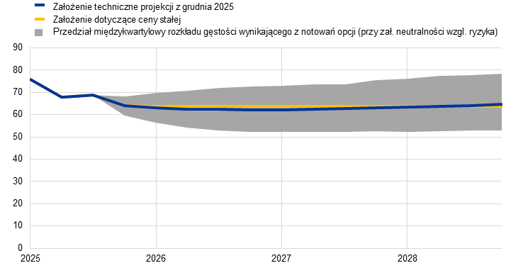 Uwagi: W niniejszej analizie wrażliwości stosuje się syntetyczny indeks cen energii, który obejmuje ceny terminowe ropy i gazu. 25. percentyl i 75. percentyl odnoszą się do rozkładu gęstości cen ropy i gazu wynikającego z notowań opcji (przy założeniu neutralności względem ryzyka) na 26 listopada 2025. Stałe ceny ropy i gazu również opierają się na wartościach z tego dnia. Skutki makroekonomiczne podaje się jako średnie wyników uzyskanych z różnych modeli makroekonomicznych stosowanych przez ekspertów EBC i Eurosystemu.