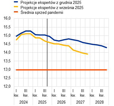 Przewiduje się, że dynamika jednostkowych kosztów pracy będzie obniżać się do 2027 włącznie, wskutek mniejszego wzrostu płac i – do pewnego stopnia – wyższej produktywności, a następnie w 2028 ustabilizuje się na poziomie 2,1%. W trzecim kwartale 2025 dynamika jednostkowych kosztów pracy nieco wzrosła i oczekuje się, że utrzyma się ona na poziomie powyżej 3% do początku 2026. Według przewidywań ta dynamika będzie się obniżać przez cały 2026 wskutek osłabienia wzrostu przeciętnego wynagrodzenia. Oczekuje się, że średnia dynamika jednostkowych kosztów pracy obniży się z 3,3% w 2025 do 2,6% w 2026 i 2,0% w 2027, po czym wzrośnie do 2,1% w 2028, czyli nieco powyżej średniej długookresowej. W porównaniu z projekcjami z września 2025 dynamika jednostkowych kosztów pracy na każdy rok horyzontu projekcji została zrewidowana w górę, ze względu na silniejszy wzrost płac, mimo nieco wyższej produktywności.