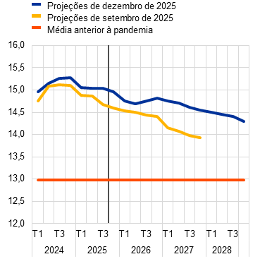 Projeta‑se que o crescimento dos custos unitários do trabalho diminua até 2027, em virtude de um menor crescimento dos salários e, em certa grau, de uma produtividade mais elevada, estabilizando depois em 2,1% em 2028. O crescimento dos custos unitários do trabalho aumentou ligeiramente no terceiro trimestre de 2025 e deverá manter‑se acima de 3% até inícios de 2026. Espera‑se que um abrandamento do crescimento da remuneração por trabalhador conduza a uma diminuição do crescimento dos custos unitários do trabalho ao longo de 2026. Em média, o crescimento dos custos unitários do trabalho deverá registar uma moderação, passando de 3,3% em 2025 para 2,6% em 2026 e 2,0% em 2027, subindo depois um pouco para 2,1% em 2028, um nível ligeiramente acima da sua média de longo prazo. Em comparação com as projeções de setembro de 2025, o crescimento dos custos unitários do trabalho foi revisto em alta para cada ano do horizonte, devido a um crescimento mais forte dos salários, não obstante uma produtividade um pouco mais elevada.