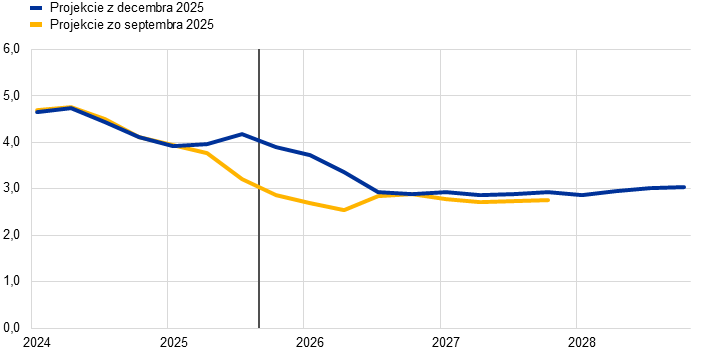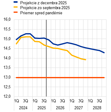 Predpokladá sa, že inflácia klesne z 2,1 % v roku 2025 na 1,9 % v roku 2026 a následne na 1,8 % v roku 2027, než v roku 2028 opäť stúpne na úroveň strednodobého cieľa ECB 2 %. Očakávaný pokles celkovej inflácie (meranej harmonizovaným indexom spotrebiteľských cien (Harmonised Index of Consumer Prices – HICP)) na začiatku roka 2026 je odrazom tlmiaceho bázického efektu vyplývajúceho z cien energií, zatiaľ čo inflácia neenergetických zložiek by sa mala počas roka 2026 naďalej zmierňovať. Očakáva sa, že príspevok inflácie cien energií k celkovej inflácii zostane až do konca roka 2027 tlmený, než sa v roku 2028 výrazne zvýši v dôsledku očakávanej implementácie systému EÚ na obchodovanie s emisiami 2 (Emissions Trading System 2 – ETS2), ktorý má spôsobiť nárast celkovej inflácie o 0,2 percentuálneho bodu. Inflácia HICP bez energií by sa mala podľa očakávaní znížiť z 2,5 % v roku 2025 na 2,2 % v roku 2026 a na 2,0 % v rokoch 2027 a 2028. Inflácia cien potravín by sa mala výrazne znížiť vzhľadom na ustupovanie vplyvu predchádzajúceho rastu cien svetových potravinových komodít a nepriaznivých poveternostných podmienok počas leta, pričom ku koncu roka 2026 sa má stabilizovať na úrovni mierne nad 2 %. Inflácia HICP bez energií a potravín (HICPX) by sa mala podľa projekcií znížiť z 2,4 % v roku 2025 na 2,0 % v roku 2028 v dôsledku poklesu inflácie cien služieb v prostredí zmierňovania tlakov nákladov práce a vzhľadom na premietanie predchádzajúceho zhodnocovania eura do cenového reťazca vedúce k oslabovaniu inflácie cien tovarov. Rast miezd by sa mal až do roku 2026 aj naďalej zmierňovať a napokon ustáliť na úrovni okolo 3 %, k čomu by mal prispieť odolný trh práce a rast produktivity tesne pod úrovňou 1 %. Rast jednotkových nákladov práce by sa mal zmierniť, hoci jeho vplyv na infláciu by mal byť čiastočne kompenzovaný postupným oživením ziskových marží počas sledovaného obdobia. V porovnaní s projekciami zo septembra 2025 bol výhľad celkovej inflácie HICP na rok 2026 upravený o 0,2 percentuálneho bodu nahor, odrážajúc nedávne prekvapivé údaje o inflácii HICP a raste miezd, ktoré v prípade rastu miezd viedli k výraznej revízii mzdového výhľadu smerom nahor. Projekcia inflácie HICP na rok 2027 bola upravená mierne nadol v dôsledku predpokladaného nižšieho príspevku inflácie cien energií, keďže sa očakáva, že zavedenie systému ETS2 sa odloží z roku 2027 na rok 2028, hoci tento príspevok by mal byť čiastočne neutralizovaný výraznejšou infláciou cien služieb.