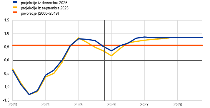 Gospodarstvo v euroobmočju se je kljub zahtevnemu svetovnemu okolju izkazalo za odporno. Realni BDP se je v tretjem četrtletju 2025 povečal za 0,3%, kar je bilo več, kot so predvidevale septembrske projekcije. To je sledilo volatilnim gibanjem v prvi polovici leta, ki so bila posledica pospešitve trgovinske menjave zaradi višjih ameriških carin in s tem povezane negotovosti ter velikih nihanj v irskih podatkih. Domače povpraševanje naj bi ostalo glavno gonilo rasti v euroobmočju ob podpori vse višjih realnih plač in zaposlenosti v okolju odpornega trga dela z rekordno nizko stopnjo brezposelnosti. Domače gospodarstvo bodo predvidoma podpirali tudi dodatni državni izdatki za infrastrukturo in obrambo, ki so bili napovedani letos, zlasti v Nemčiji, skupaj z izboljšanimi pogoji financiranja, ki so posledica rezov obrestnih mer denarne politike od junija 2024 dalje. Kar zadeva zunanje okolje, so na področju konkurenčnosti sicer še vedno prisotni izzivi, vključno z nekaterimi, ki so strukturne narave, vendar naj bi se izvoz naslednje leto okrepil. Izboljšanje bo posledica odboja tujega povpraševanja ob zmanjševanju negotovosti glede trgovinskih politik, čeprav bo vpliv višjih carin čedalje bolj opazen. Povprečna letna realna rast BDP bo po projekcijah znašala 1,4% v letu 2025, 1,2% v letu 2026, 1,4% v letu 2027 in 1,4% v letu 2028. V primerjavi s septembrskimi projekcijami je bila rast BDP popravljena navzgor v celotnem obdobju projekcij, in sicer zaradi boljših podatkov od pričakovanih, manjše negotovosti glede trgovinskih politik, močnejšega zunanjega povpraševanja in nižjih cen energetskih surovin.[1]