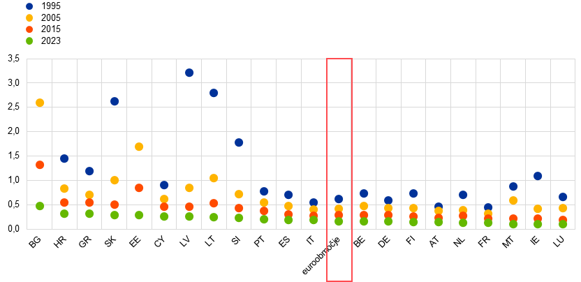 Rast stroškov dela na enoto proizvoda se bo po projekcijah tekom leta 2027 zmanjšala, k čemur bo prispevala nižja rast plač in do neke mere tudi višja produktivnost, nato pa se bo leta 2028 ustalila na 2,1-odstotni ravni. Rast stroškov dela na enoto proizvoda se je v tretjem četrtletju 2025 rahlo povečala in bo do začetka leta 2026 predvidoma ostala nad 3%. Zaradi umirjanja rasti sredstev za zaposlene na zaposlenega naj bi se rast stroškov dela na enoto proizvoda v celotnem letu 2026 upočasnjevala. V povprečju naj bi se rast stroškov dela na enoto proizvoda umirila s 3,3% v letu 2025 na 2,6% v letu 2026 in 2,0% v letu 2027, nato pa naj bi se leta 2028 rahlo povečala na 2,1%, kar je nekoliko nad dolgoročnim povprečjem. V primerjavi s septembrskimi projekcijami je bila rast stroškov dela na enoto proizvoda popravljena navzgor za vsako leto v obdobju projekcij, in sicer zaradi močnejše rasti plač kljub rahlo višji produktivnosti.