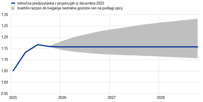 Opombe: Povečanje pomeni apreciacijo eura. 25. in 75. centil se nanašata na gostoto tečaja USD/EUR na dan 26. novembra 2025, kot izhaja iz opcij.