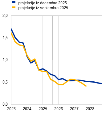 Po projekcijah se bo inflacija znižala z 2,1% v letu 2025 na 1,9% v letu 2026 in nato na 1,8% v letu 2027, zatem pa se bo leta 2028 zvišala na 2%, kar je srednjeročni cilj ECB. Pričakovano znižanje skupne inflacije (merjene s harmoniziranim indeksom cen življenjskih potrebščin, HICP) v začetku leta 2026 je posledica navzdol delujočih baznih učinkov, ki izhajajo iz cen energentov, medtem ko naj bi se inflacija v drugih skupinah razen energentov tekom leta 2026 še naprej zniževala. Prispevek inflacije v skupini energentov k skupni inflaciji bo do konca leta 2027 predvidoma ostal umirjen, nato pa naj bi se leta 2028 izrazito povečal zaradi pričakovane uvedbe 2. generacije sistema EU za trgovanje z emisijami (ETS2), kar naj bi skupno inflacijo potisnilo navzgor za 0,2 odstotne točke. Inflacija brez energentov se bo po pričakovanjih znižala z 2,5% v letu 2025 na 2,2% v letu 2026 ter na 2,0% v letih 2027 in 2028. Inflacija v skupini hrane se bo po projekcijah opazno znižala, saj bodo učinki predhodne rasti cen svetovnih prehrambnih surovin in neugodnih vremenskih razmer v poletnih mesecih popustili, proti koncu leta 2026 pa naj bi se ustalila na ravni nekoliko nad 2%. Inflacija brez energentov in hrane se bo po projekcijah umirila z 2,4% v letu 2025 na 2,0% v letu 2028, ko se bo storitvena inflacija znižala zaradi vse manjših pritiskov s strani stroškov dela in ko se bo pretekla apreciacija eura prelila vzdolž cenovne verige, kar bo zaviralo blagovno inflacijo. Rast plač naj bi se med letom 2026 še naprej umirjala, nato pa naj bi se stabilizirala na ravni okrog 3% ob podpori odpornega trga dela in rasti produktivnosti tik pod 1%. Rast stroškov dela na enoto proizvoda se bo predvidoma umirila, vseeno pa naj bi vpliv na inflacijo deloma odtehtalo postopno okrevanje profitnih marž v obdobju projekcij. V primerjavi s septembrskimi projekcijami so bili obeti glede skupne inflacije za leto 2026 popravljeni navzgor za 0,2 odstotne točke zaradi nedavnih presenečenj v podatkih o inflaciji in rasti plač, pri čemer je slednje privedlo do opaznega popravka plačnih obetov navzgor. Projekcija inflacije za leto 2027 je bila rahlo popravljena navzdol zaradi predpostavljenega manjšega prispevka inflacije v skupini energentov, saj se zdaj pričakuje, da bo uvedba sistema ETS2 preložena z leta 2027 na leto 2028, čeprav naj bi bil ta prispevek delno izravnan z višjo storitveno inflacijo.