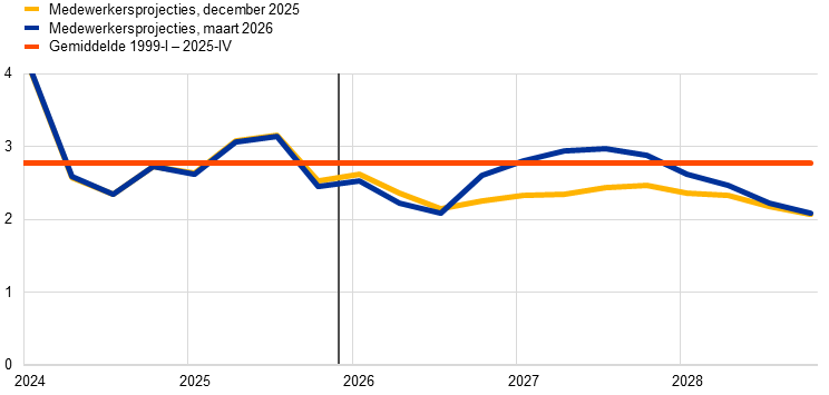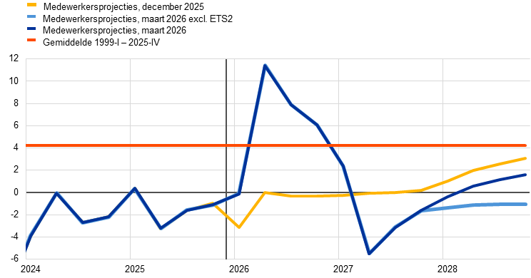Toelichting: Historische gegevens kunnen afwijken van de meest recente Eurostat-publicaties. De verticale lijn geeft het begin van de huidige projectieperiode aan. In deze grafiek zijn geen onzekerheidsmarges rond de projecties opgenomen. De reden daarvoor is dat de standaardberekening van de waaiergrafieken (gebaseerd op historische projectiefouten) in de huidige omstandigheden geen betrouwbare indicatie zou geven van de grote onzekerheid rond de huidige projecties. Om de huidige onzekerheid beter weer te geven, worden in plaats daarvan in Paragraaf 3 alternatieve scenario’s gepresenteerd die uitgaan van verschillende gradaties van ernst van de economische effecten door de oorlog in het Midden-Oosten.
