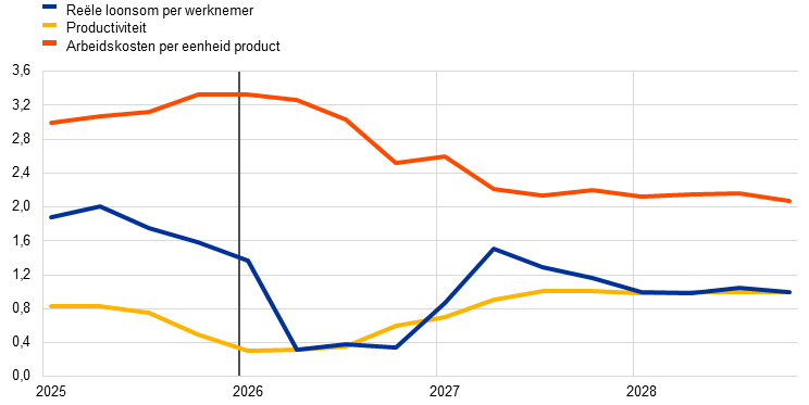 De inflatie, gemeten aan de hand van de geharmoniseerde consumptieprijsindex (HICP), zal in het tweede kwartaal van 2026 naar verwachting sterk stijgen tot 3,1% door een forse toename van de energie-inflatie als gevolg van de crisis in het Midden-Oosten, om vervolgens in het derde kwartaal af te nemen tot 2,8%, na dalingen van de prijzen van energiegrondstoffen, zoals vervat in de futuresprijzen. De basisprojecties voorzien een negatieve energie-inflatie in 2027 door vooral neerwaartse basiseffecten voor energie, om daarna in 2028 aanzienlijk toe te nemen door de invoering van het nieuwe emissiehandelssysteem van de EU (ETS2), dat naar verwachting een opwaarts effect van 0,2 procentpunt op de totale inflatie zal hebben. De voedselinflatie zal naar verwachting vanaf eind 2026 aantrekken door het doorwerken van fors toegenomen energieprijzen naar de consumptieprijzen voor voedingsmiddelen, alvorens in 2028 af te nemen. De HICP-inflatie exclusief energie en voedingsmiddelen (HICPX) zal volgens de projecties licht afnemen van 2,4% in 2025 tot 2,1% in 2028. Hoewel de HICPX-inflatie ook wordt beïnvloed door kostendruk vanwege hogere energieprijzen, wordt deze getemperd door een lichte afname van de arbeidskostendruk, de eerdere appreciatie van de euro en de invoerpenetratie vanuit China. Al met al gaan de basisprojecties uit van een HICP-inflatie die aantrekt van 2,1% in 2025 tot 2,6% in 2026, om daarna in 2027 te dalen naar 2,0% en in 2028 weer op te lopen tot 2,1%. De loongroei zal de komende jaren matigen, zij het in een trager tempo dan verwacht in eerdere projecties als gevolg van enkele effecten van inflatiecompensatie in verband met de energieprijsschok. Vergeleken met de projecties van december 2025 zijn de vooruitzichten voor de HICP-inflatie met 0,7 procentpunt naar boven bijgesteld voor 2026, voornamelijk als gevolg van de energiecomponent. De vooruitzichten voor 2027 zijn opwaarts bijgesteld met 0,2 procentpunt en die voor 2028 met 0,1 procentpunt, doordat de kostendruk door hogere energieprijzen doorwerkt in de HICPX- en voedingsmiddelencomponenten. Daarbij is de energiecomponent iets naar beneden bijgesteld.