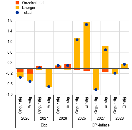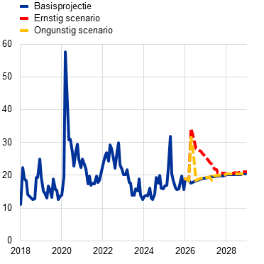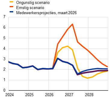 Naast de basisprojecties hebben de medewerkers alternatieve, hypothetische scenario’s opgesteld met verschillende aannames voor de omvang en duur van de energieprijsschok, de invloed ervan op het internationale klimaat en de onzekerheid, en de doorwerking op de inflatie via indirecte en tweederonde-effecten. Deze scenario’s illustreren alternatieve ontwikkelingen van de prijzen van energiegrondstoffen en de doorwerking ervan naar de economie van het eurogebied. De medewerkers kennen geen kansen toe aan deze scenario’s. Ze zijn bedoeld om de belangrijkste onzekerheden met betrekking tot de effecten van het conflict te benadrukken. Zoals gebruikelijk in de projecties van medewerkers illustreren deze scenario’s de effecten op de economie van het eurogebied zonder rekening te houden met eventuele monetaire of budgettaire beleidsreacties, anders dan die al in het basisscenario zijn opgenomen. Het ongunstige scenario omvat sterkere indirecte en tweederonde-effecten dan het basisscenario, en weerspiegelt mogelijke niet-lineaire doorwerking van de initiële energieprijsschok naar andere prijzen in de bredere economie. Het scenario gaat uit van een veel sterkere stijging van de energieprijzen, een toenemende onzekerheid en negatieve internationale overloopeffecten (zoals een verminderde buitenlandse vraag). De aanname is dat de olie- en gasprijzen in het tweede kwartaal van 2026 een piek bereiken van respectievelijk USD 119 per vat en EUR 87 per MWh, alvorens tegen het derde kwartaal van 2027 weer samen te vallen met de aannames van het basisscenario. Ten opzichte van het basisscenario impliceert het ongunstige scenario dat de inflatie in 2026 en 2027 respectievelijk 0,9 procentpunt en 0,1 procentpunt hoger zou liggen, maar 0,5 procentpunt lager in 2028 als gevolg van desinflatoire druk door de snelle normalisatie van de energieprijzen in dat jaar. Omgekeerd is de economische groei in 2026 en 2027 juist lager dan in het basisscenario, maar hoger in 2028. Vergeleken met het ongunstige scenario gaat het ernstige scenario uit van een sterkere en langer aanhoudende energieprijsschok, grotere onzekerheid en nog sterkere indirecte en tweederonde-effecten. Er wordt aangenomen dat de olie- en gasprijzen in het tweede kwartaal van 2026 een piek bereiken van USD 145 per vat en EUR 106 per MWh, alvorens in een veel trager tempo te dalen en gedurende de rest van de projectieperiode aanzienlijk boven zowel de aannames van het basisscenario als die van het ongunstige scenario te blijven. Ten opzichte van het basisscenario zou de totale inflatie gedurende de projectieperiode aanzienlijk en aanhoudend hoger zijn (met 1,8 procentpunt in 2026, 2,8 procentpunt in 2027 en 0,7 procentpunt in 2028). Het aanzienlijke verschil in inflatie in 2028 tussen het ongunstige scenario (1,6%) en het ernstige scenario (2,8%), zoals weergegeven in Tabel 1, benadrukt de sleutelrol van de verdere ontwikkeling van het conflict, de verstoring van de energievoorziening en de omvang van de doorwerking van de schok bij het bepalen van het effect op de inflatie op middellange termijn. De economische groei zou in 2026-2027 0,4-0,5 procentpunt lager uitvallen, en in 2028 stijgen tot 0,5 procentpunt boven het basisscenario. De toename van de groei tegen het einde van de projectieperiode is toe te schrijven aan de veronderstelde stijging van het inkomen en de vraag als gevolg van de opwaartse reactie van de lonen na de stijging van de inflatie in de voorgaande jaren.
