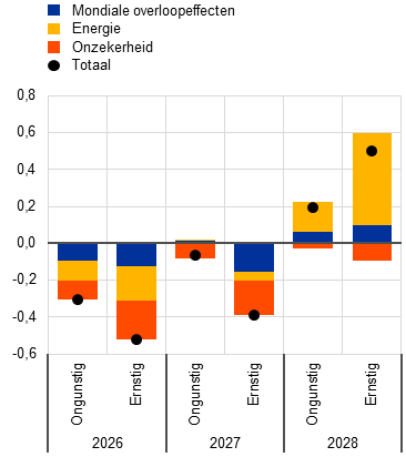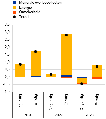 In het ernstige scenario wordt verondersteld dat de energieprijzen een sterkere en langdurigere impact hebben en gepaard gaan met effecten van verhoogde onzekerheid. De reële bbp-groei ligt in 2026 en 2027 respectievelijk 0,5 procentpunt en 0,4 procentpunt lager, met negatieve groeicijfers op kwartaalbasis in het tweede en derde kwartaal van 2026 (Grafiek 14, paneel a). Hoewel de energieschok de belangrijkste aanjager blijft, speelt ook de onzekerheid een rol en versterkt deze de neergang, naast mondiale overloopeffecten. De HICP-inflatie ligt in 2026 1,8 procentpunt hoger en blijft hoog: op 2,8 procentpunt boven het basisscenario in 2027 en 0,7 procentpunt boven het basisscenario in 2028. De effecten op de HICPX-inflatie zijn sterker dan in het ongunstige scenario, met meer dan 1 procentpunt in de periode 2027-2028.