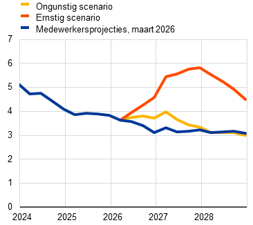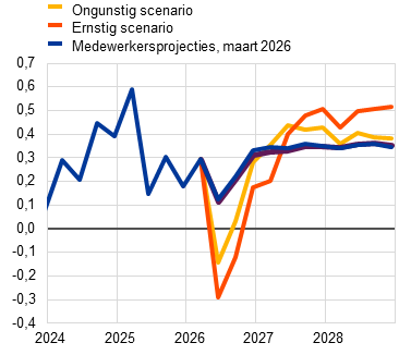 Tot slot komen gunstigere vooruitzichten tot uiting in een reeks projecties op basis van technische aannames met als afsluitdatum 4 maart (inclusief gegevens van de eerste drie werkdagen na het begin van de oorlog in het Midden-Oosten), met veronderstelde piekprijzen voor olie en gas van USD 79 per vat en EUR 48 per MWh in het tweede kwartaal van 2026.[2] Volgens deze projecties zou de inflatie 0,3 procentpunt onder het definitieve basisscenario uitkomen in 2026, en 0,1 procentpunt lager in 2027 en 2028, bij een 0,1 procentpunt hogere groei in elk jaar van de projectieperiode.