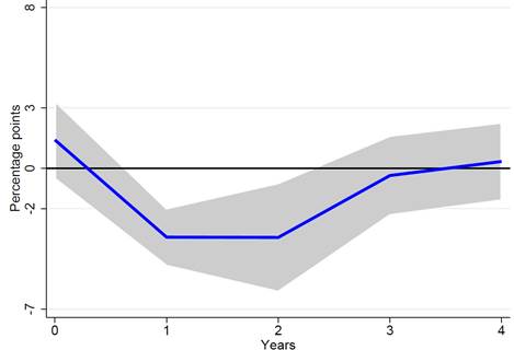Chart 1 shows how the average firm’s investment reacts over the four years following a 10-basis-point upward surprise in the short-term interest rate, i.e. how firms’ investment reacts to a tightening of monetary policy. The investment rate of the average firm does not react initially, but drops by 3.4 percentage points in the year following the monetary policy shock. In the second year after the shock, the investment rate remains at this lower level. It then returns to its initial level in the third year.
