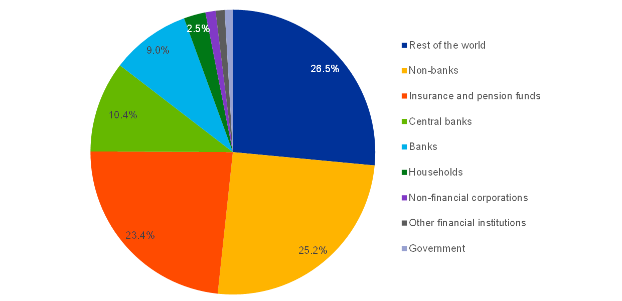 Figure 2 shows that traditional “buy-and-hold” investors held a large share of the aggregate in 2019. Insurance companies and pension funds held approximately a quarter of the total, and the European Central Bank (ECB) another 10%. Investment funds held 25% and financial institutions and households less than 15%, while the rest of the world covered the final 26%.