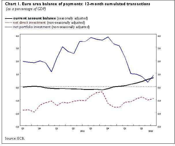 In July 2012 the seasonally adjusted current account of the euro area recorded a surplus of €9.7 billion. In the financial account, combined direct and portfolio investment recorded net inflows of €18 billion (non-seasonally adjusted).