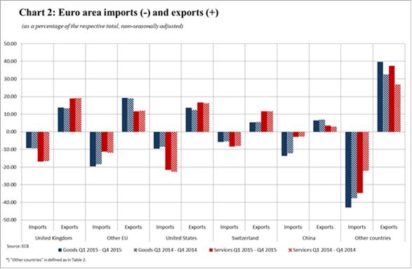 In 2015 non-euro area EU Member States (excluding the United Kingdom) remained the euro area’s main partners for trade in goods – accounting for approximately 19% of all euro area imports and exports – followed by the United Kingdom for exports and China for imports (see Chart 2). As regards euro area trade in services, the United Kingdom was the largest recipient of exports (accounting for 19% of the total) and the United States the largest provider, accounting for more than 22% of total euro area imports of services.
