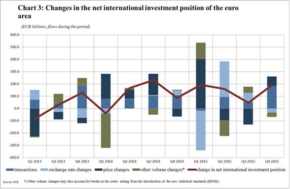 At the end of 2015 the international investment position of the euro area recorded net liabilities of €0.4 trillion vis-à-vis the rest of the world (approximately 4% of euro area GDP; see Chart 1). This represented a decrease of around €190 billion compared with the net position in the third quarter of 2015 (see Table 3).