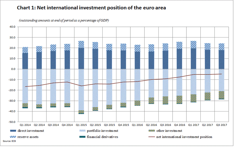 At the end of the third quarter of 2017 the international investment position of the euro area recorded net liabilities of €0.5 trillion (approximately 5% of euro area GDP).