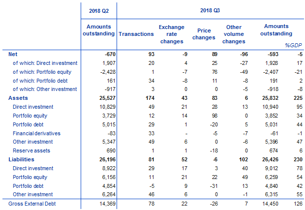 - At the end of the third quarter of 2018 the international investment position of the euro area recorded net liabilities of €593 billion (around 5% of euro area GDP), compared with net liabilities of €670 billion at the end of the previous quarter.
