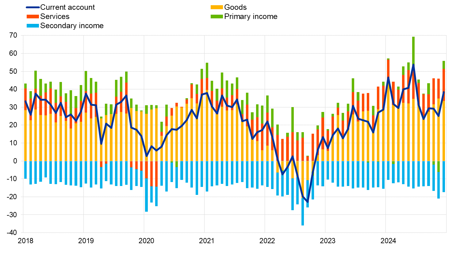 The current account of the euro area recorded a surplus of €38 billion in December 2024, an increase of €13 billion from the previous month (Chart 1 and Table 1). Surpluses were recorded for goods (€33 billion), services (€18 billion) and primary income (€4 billion). These were partly offset by a deficit for secondary income (€17 billion).