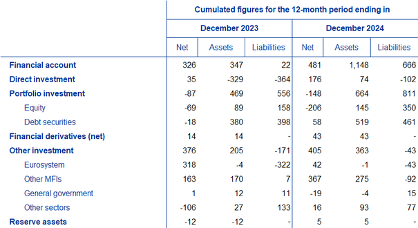 - Current account recorded €38 billion surplus in December 2024, up from €25 billion in previous month