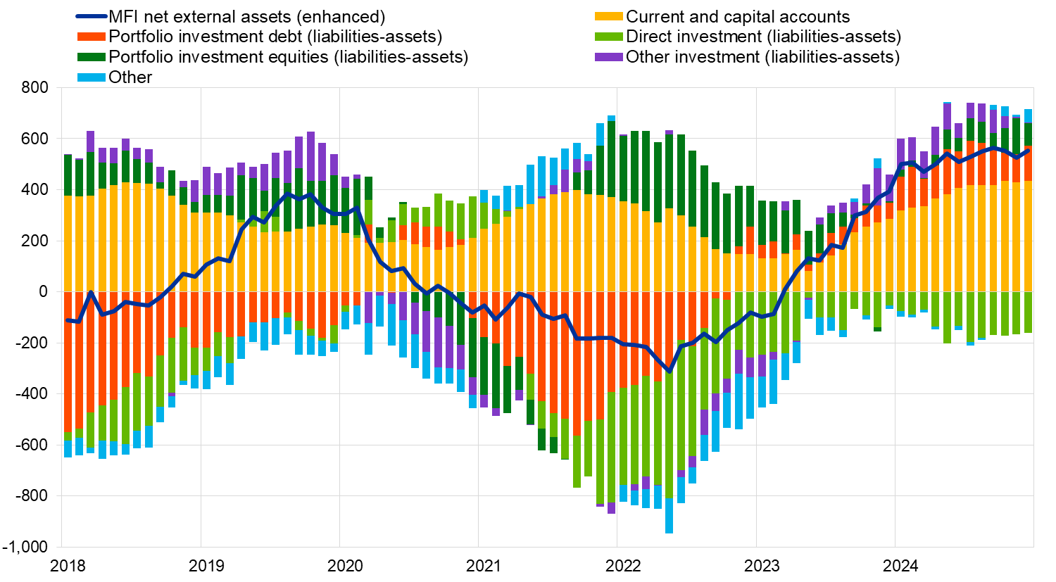 The monetary presentation of the balance of payments (Chart 3) shows that the net external assets (enhanced) of euro area MFIs increased by €553 billion in 2024. This increase was mainly driven by the current and capital accounts surplus and, to a lesser extent, by euro area non-MFIs’ net inflows in portfolio investment debt and portfolio investment equity. These developments were partly offset by euro area non-MFIs’ net outflows in direct investment.