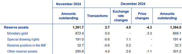 In December 2024 the Eurosystem’s stock of reserve assets increased to €1,394.0 billion up from €1,391.7 billion in the previous month (Table 3). This increase was driven by positive exchange rate changes (€4.0 billion) and, to a lesser extent, by net acquisitions of assets (€2.7 billion) which were partly offset by negative price changes (€4.3 billion).