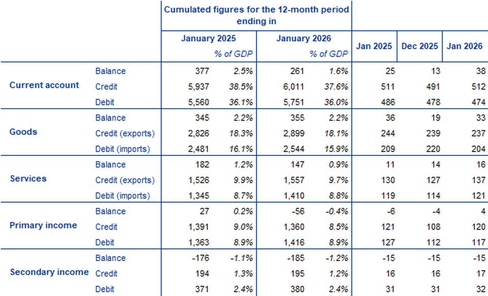In the 12 months to January 2026, the current account recorded a surplus of €261 billion (1.6% of euro area GDP), compared with a surplus of €377 billion (2.5% of euro area GDP) one year earlier. This decrease was mainly driven by a switch from a surplus (€27 billion) to a deficit (€56 billion) for primary income and, to a lesser extent, by a reduction in the surplus for services (down from €182 billion to €147 billion) and a larger deficit for secondary income (up from €176 billion to €185 billion). These developments were partly offset by a larger surplus for goods (up from €345 billion to €355 billion).