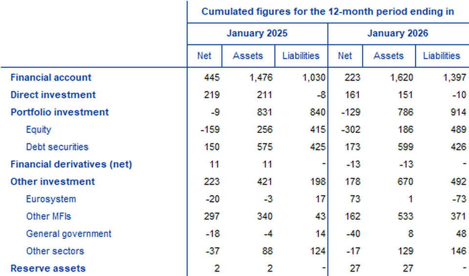 In other investment, euro area residents recorded net acquisitions of non-euro area assets amounting to €670 billion in the 12 months to January 2026 (following net acquisitions of €421 billion one year earlier), while their net incurrence of liabilities increased to €492 billion (up from €198 billion one year earlier).