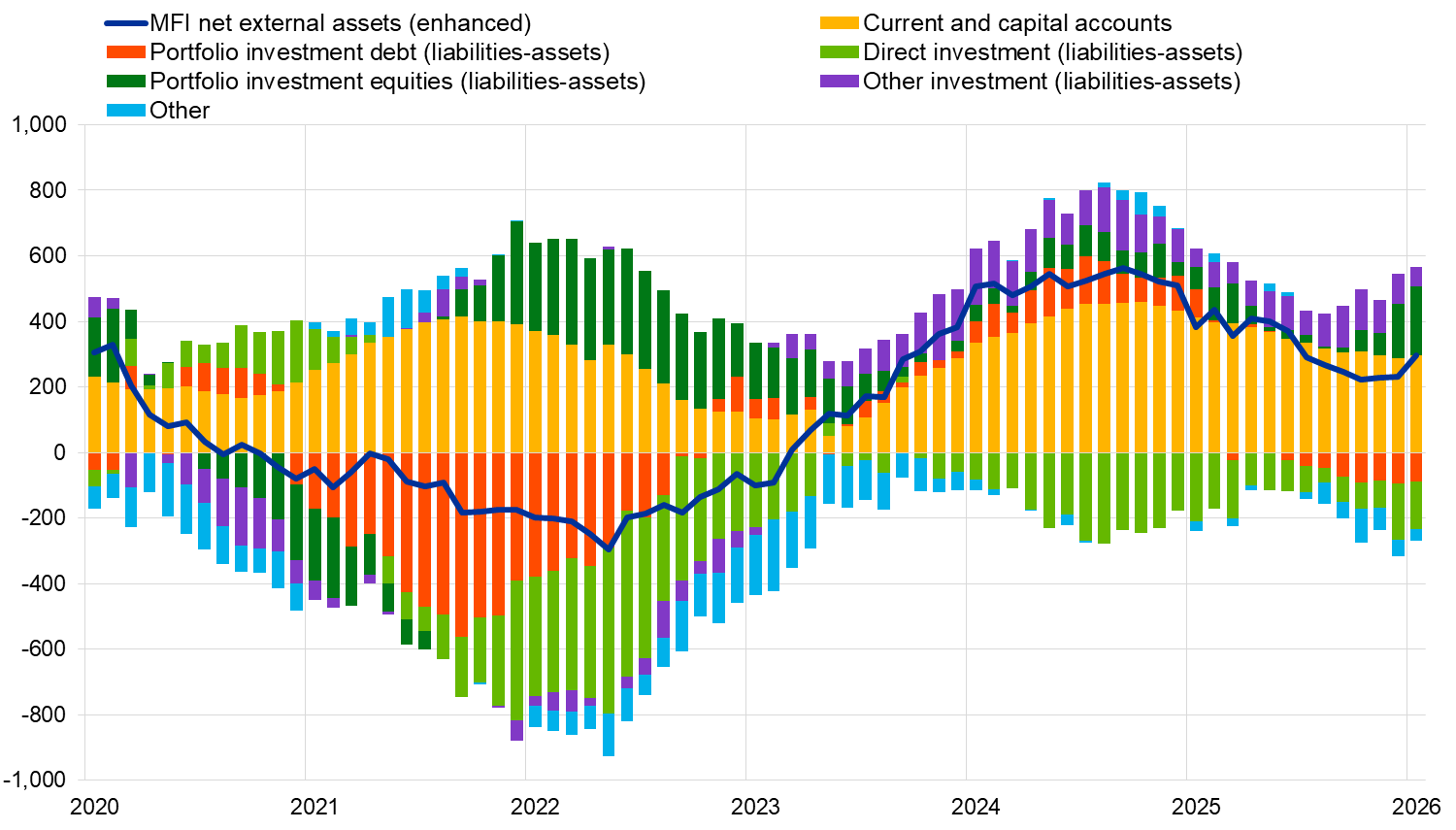 The monetary presentation of the balance of payments (Chart 3) shows that the net external assets (enhanced) of euro area MFIs increased by €295 billion in the 12 months to January 2026. This increase was driven by the current and capital accounts surplus and euro area non-MFIs’ net inflows in portfolio investment equity and other investment. These developments were partly offset by euro area non-MFIs’ net outflows in direct investment, portfolio investment debt and other flows.