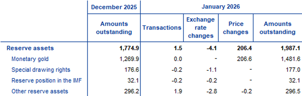 In January 2026 the Eurosystem’s stock of reserve assets increased to €1,987.1 billion up from €1,774.9 billion in the previous month (Table 3). This increase was mainly driven by positive price changes (€206.4 billion), explained by the increase in the price of gold, and, to a lesser extent, by net acquisitions of assets (€1.5 billion) which were partly offset by negative exchange rate changes (€4.1 billion).