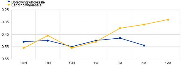 In the latest maintenance period, the borrowing turnover in the secured segment averaged €299 billion per day, while the total borrowing turnover for the period as a whole was €8,066 billion. Cash lending represented a turnover of €6,480 billion and the daily average amounted to €240 billion. Most of the turnover was concentrated in tenors ranging from overnight to up to one week, with overnight transactions representing around 21% and 25% of the total nominal amount on the borrowing and lending side respectively. The weighted average overnight rate for borrowing and lending transactions was, respectively, -0.51% and -0.56% for the wholesale sector, compared with -0.51% and -0.52% respectively in the previous maintenance period.