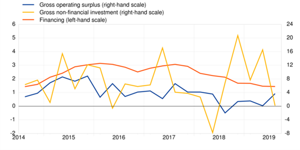 - The annual growth rate of the gross operating surplus of non-financial corporations (NFCs) was 3.7% in the third quarter of 2019, higher than in the previous quarter (0.1%). Gross entrepreneurial income increased at a higher rate of 2.5% (after 1.6%). The annual growth rate of NFCs' gross non-financial investment decreased to 0.1% (from 16.6%, which mainly reflected the import of intellectual property products), while their financing increased at a broadly unchanged rate of 1.4%.