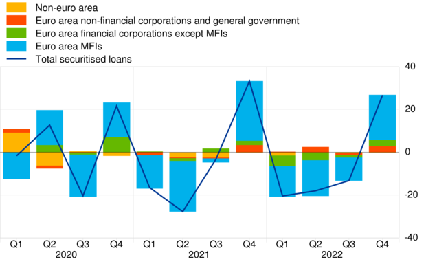 Turning to the borrowing sector of securitised loans, loans to euro area households amounted to €737 billion at the end of the fourth quarter of 2022, with a net acquisition of €4 billion during the fourth quarter of 2022, while loans to euro area non-financial corporations amounted to €420 billion, with a net acquisition of €19 billion.
