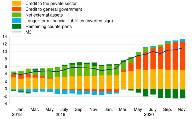 As a reflection of changes in the items on the monetary financial institution (MFI) consolidated balance sheet other than M3 (counterparts of M3), the annual growth rate of M3 in November 2020 can be broken down as follows: credit to general government contributed 7.7 percentage points (up from 7.3 percentage points in October), credit to the private sector contributed 5.1 percentage points (down from 5.2 percentage points), longer-term financial liabilities contributed 0.7 percentage point (up from 0.3 percentage point), net external assets contributed -0.2 percentage point (down from 0.1 percentage point), and the remaining counterparts of M3 contributed -2.3 percentage points (up from -2.5 percentage points).