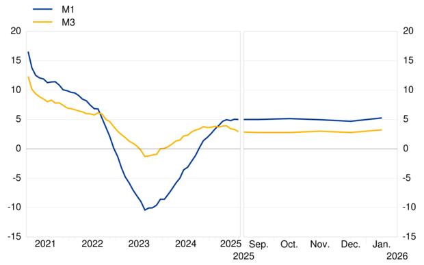 The annual growth rate of the broad monetary aggregate M3 increased to 3.3% in January 2026 from 2.8% in December, averaging 3.0% in the three months up to January. The components of M3 showed the following developments. The annual growth rate of the narrower aggregate M1, which comprises currency in circulation and overnight deposits, increased to 5.3% in January from 4.7% in December. The annual growth rate of short-term deposits other than overnight deposits (M2-M1) was ‑0.6% in January, compared with -0.4% in December. The annual growth rate of marketable instruments (M3-M2) increased to 1.6% in January from -0.6% in December.