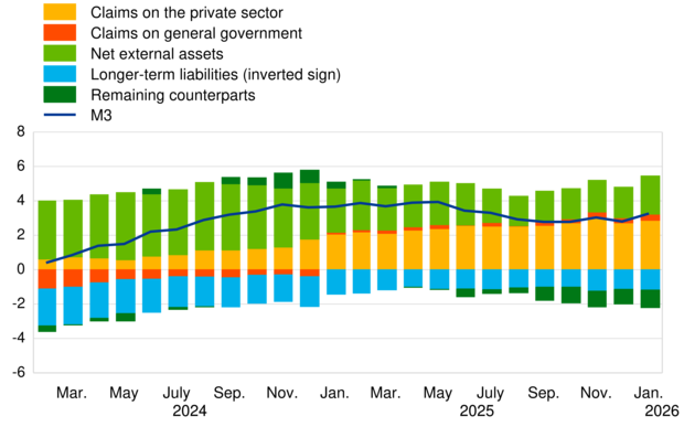 The annual growth rate of M3 in January 2026, as a reflection of changes in the items on the monetary financial institution (MFI) consolidated balance sheet other than M3 (counterparts of M3), can be broken down as follows: claims on the private sector contributed 2.9 percentage points (up from 2.7 percentage points in December), net external assets contributed 2.2 percentage points (up from 1.8 percentage points), claims on general government contributed 0.4 percentage points (up from 0.3 percentage points), longer-term liabilities contributed -1.2 percentage points (down from -1.1 percentage points), and the remaining counterparts of M3 contributed -1.0 percentage points (down from -0.9 percentage points).