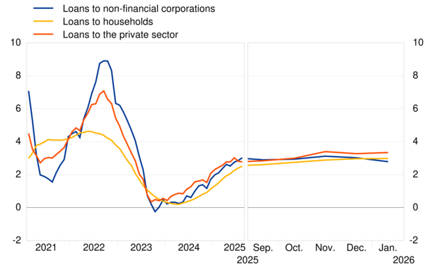 - Annual growth rate of broad monetary aggregate M3 increased to 3.3% in January 2026 from 2.8% in December