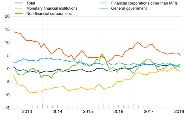Concerning the currency breakdown, the annual growth rate of outstanding euro-denominated debt securities was 1.5% in July 2018, compared with 1.4% in June. For debt securities in other currencies, this rate of change decreased from -0.2% in June 2018 to -1.2% in July.
