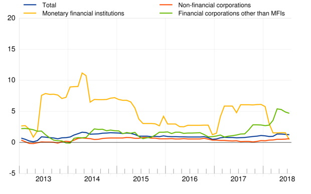 New issuance of listed shares by euro area residents totalled EUR 3.8 billion in July 2018. Redemptions amounted to EUR 2.3 billion and net issues to EUR 1.5 billion. The annual growth rate of the outstanding amount of listed shares issued by euro area residents (excluding valuation changes) was 1.2% in July 2018, compared with 1.3% in June. The annual growth rate of listed shares issued by non-financial corporations was 0.6% in July 2018, compared with 0.5% in June. For MFIs, the corresponding growth rate decreased from 1.6% in June 2018 to 0.4% in July. For financial corporations other than MFIs, this growth rate was 4.7% in July 2018, compared with 4.9% in June.