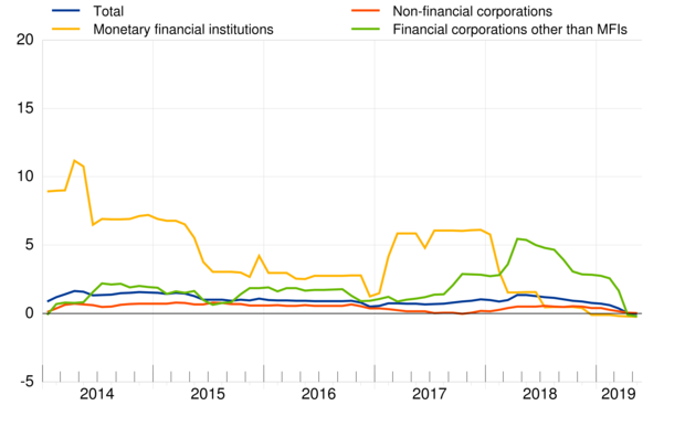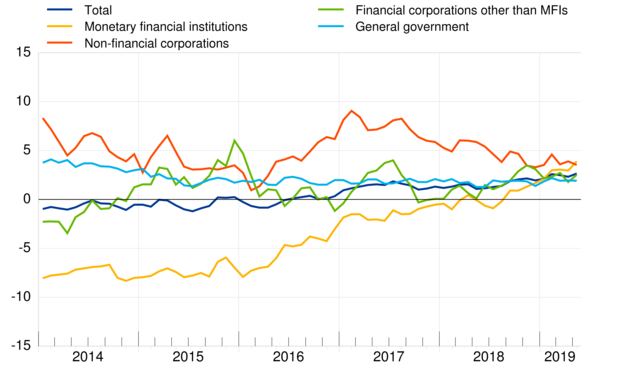 As regards the sectoral breakdown, the annual growth rate of outstanding debt securities issued by non-financial corporations decreased from 3.9% in April 2019 to 3.5% in May. For the monetary financial institutions (MFIs) sector, this growth rate increased from 2.9% in April 2019 to 3.9% in May. The annual growth rate of outstanding debt securities issued by financial corporations other than MFIs increased from 1.8% in April 2019 to 2.5% in May. For the general government, this growth rate was 1.9% in May 2019, compared with 2.0% in April.