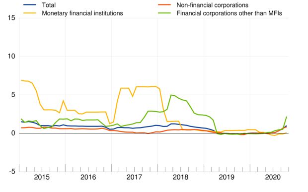 Concerning the currency breakdown, the annual growth rate of outstanding euro-denominated debt securities was 9.6% in October 2020, compared with 9.4% in September. For debt securities in other currencies, this rate of change increased from -0.2% in September 2020 to 0.6% in October.