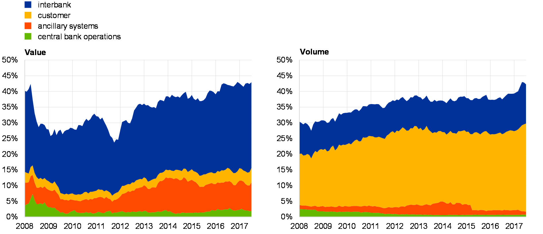 In terms of the activities involving market participants (i.e. excluding central bank and ancillary system transactions), interbank transactions (transactions exclusively involving credit institutions) accounted for 78% of the total value of the payments in 2017, whereas the remaining share was composed of customer transactions (i.e. transactions processed on behalf of a non-bank party, be it an individual or a corporate). Compared with the previous year, the value of both types of payment increased: by 8% for interbank payments and by 2% for customer payments.