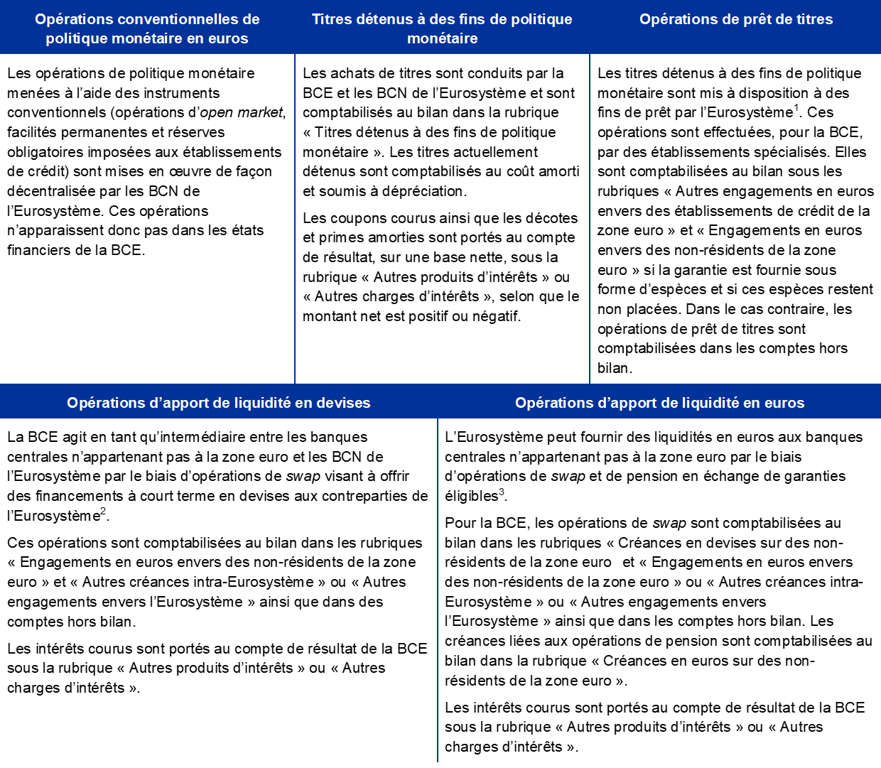 Les opérations de politique monétaire de l’Eurosystème sont comptabilisées dans les états financiers de la BCE et des banques centrales nationales (BNC) de la zone euro, conformément au principe de mise en œuvre décentralisée de la politique monétaire de l’Eurosystème. Le tableau 1 ci-dessous fournit une vue d’ensemble des principales opérations et fonctions de la BCE dans la réalisation de son mandat et leur incidence sur les états financiers de la BCE.