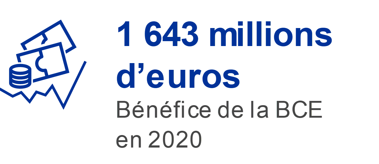 En 2020, le bénéfice de la BCE s’est établi à 1 643 millions d’euros, contre (contre 2 366 millions en 2019). La baisse de 722 millions d’euros par rapport à 2019 découle principalement de la baisse des produits d’intérêts nets.