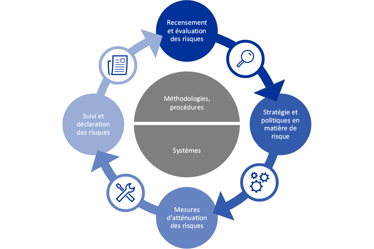 - Le risque opérationnel est défini comme le risque de répercussions financières négatives, en termes d’activité ou d’image, résultant de personnes, de la mise en œuvre inadéquate ou du défaut de mise en œuvre de processus opérationnels et de gouvernement d’entreprise, de la défaillance de systèmes sur lesquels sont basés des processus ou d’événements extérieurs (comme des catastrophes naturelles ou des attaques extérieures).