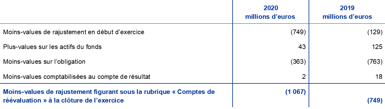 - Le régime à prestations définies n’intègre que les cotisations obligatoires versées par la BCE et les employés. Les membres du personnel ont effectué des versements supplémentaires, sur une base volontaire, dans un fonds à cotisations définies, qui se sont élevés en 2020 à 186 millions d’euros (contre 171 millions en 2019). Ces contributions sont investies dans les actifs du fonds et donnent lieu à une obligation correspondante de valeur égale.