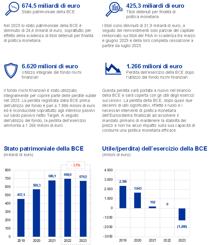 Nel 2023 lo stato patrimoniale della BCE ammonta a 674,5 miliardi di euro, evidenziando una diminuzione di 24,4 miliardi di euro principalmente dovuta alla graduale riduzione del portafoglio del PAA a seguito dei reinvestimenti solo parziali del capitale rimborsato sui titoli in scadenza tra marzo e giugno 2023 e della loro completa cessazione a luglio 2023.
