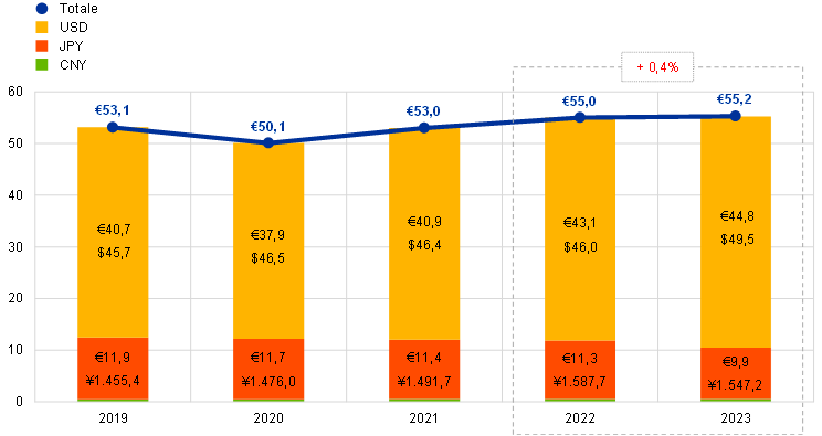 Nel 2023 il controvalore totale in euro delle riserve in valuta della BCE, costituite da oro, diritti speciali di prelievo, dollari statunitensi, yen giapponesi e renminbi cinesi, è aumentato di 3,3 miliardi di euro raggiungendo 87,7 miliardi.