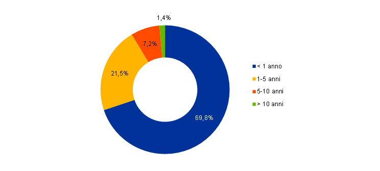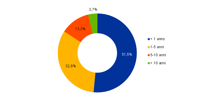 Il portafoglio detenuto a fronte dei fondi propri della BCE è costituito prevalentemente dagli investimenti del capitale versato e delle consistenze del fondo di riserva generale e del fondo rischi finanziari. La finalità del portafoglio è fornire un reddito che contribuisca a finanziare le spese operative della BCE che non sono connesse alle funzioni di vigilanza[13]. Il portafoglio è investito in attività denominate in euro, rispettando i limiti imposti dal sistema di controllo dei rischi. La struttura per scadenze risulta quindi più differenziata (grafico 9) rispetto a quella del portafoglio delle riserve valutarie.
