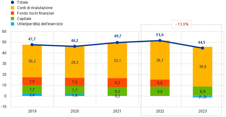 A fine 2023 il patrimonio netto della BCE ammonta a 44,5 miliardi di euro (grafico 11), importo inferiore di 7,0 miliardi di euro rispetto a fine 2022 per effetto delle perdite subite nell’anno. Il fondo rischi finanziari è stato utilizzato interamente per ripianare parte di queste perdite, riducendo a 1,3 miliardi di euro la perdita dell’esercizio. La diminuzione del patrimonio netto della BCE dovuta alle perdite del 2023 è stata parzialmente compensata (1) dall’incremento dei conti di rivalutazione, ascrivibile soprattutto al rialzo del prezzo di mercato dell’oro espresso in euro nel 2023, e (2) dai contributi della Hrvatska narodna banka al capitale versato, ai conti di rivalutazione e al fondo rischi finanziari, a seguito dell’adozione della moneta unica da parte della Croazia con effetto dal 1° gennaio 2023.
