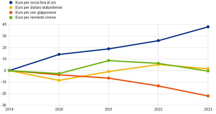 Il controvalore in euro delle attività in valuta estera[11] (dollari statunitensi, yen giapponesi e renminbi cinesi) detenute dalla BCE è aumentato di 0,2 miliardi di euro collocandosi a 55,2 miliardi (grafico 5), principalmente a seguito dei proventi percepiti durante l’anno, soprattutto sul portafoglio in dollari statunitensi. Inoltre, a seguito dell’adozione della moneta unica da parte della Croazia con effetto dal 1° gennaio 2023, la Hrvatska narodna banka ha trasferito alla BCE riserve ufficiali denominate in dollari statunitensi per un controvalore di 544 milioni di euro. L’incremento del valore totale delle attività in valuta estera è stato parzialmente compensato soprattutto dal deprezzamento del dollaro statunitense e dello yen giapponese nei confronti dell’euro.